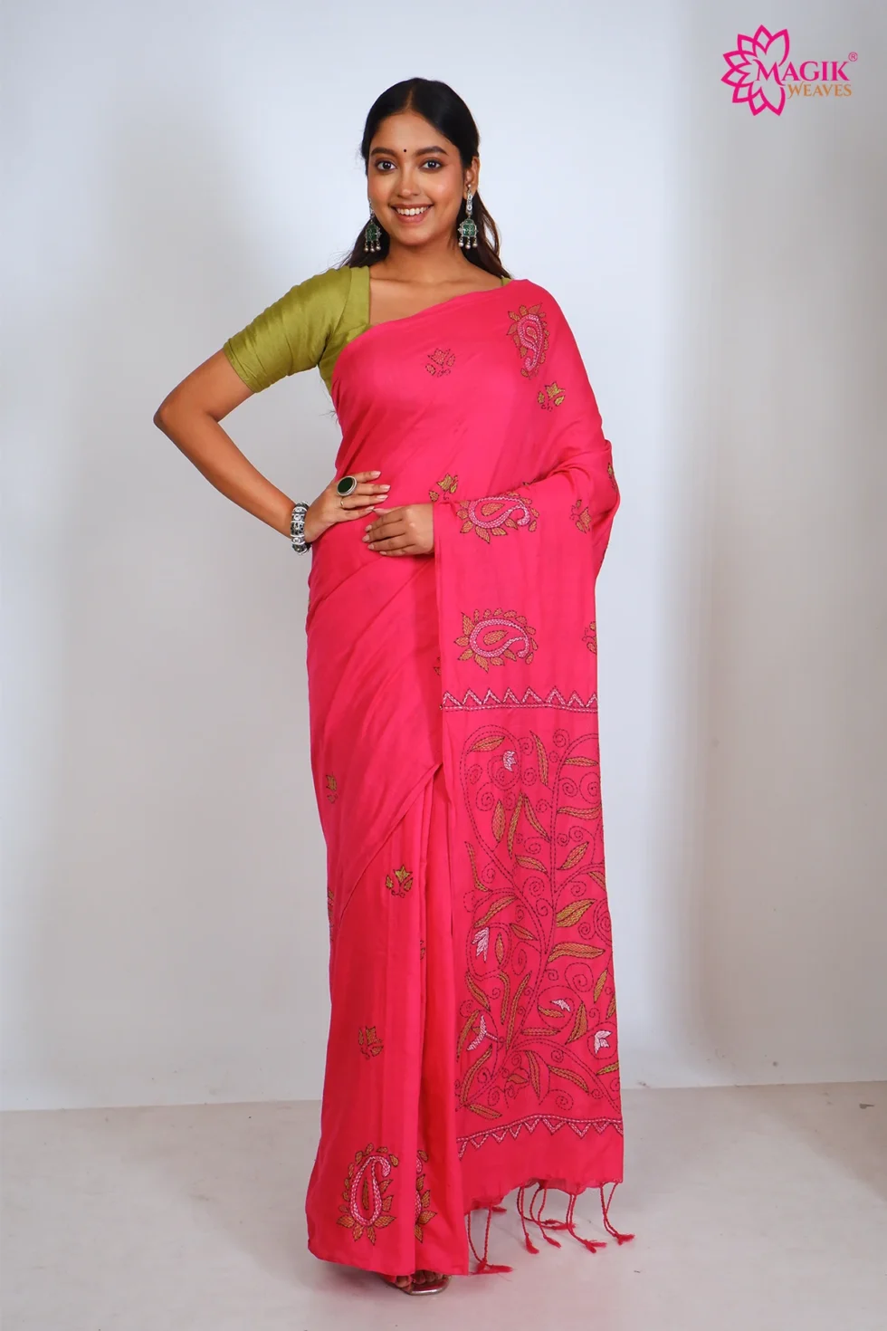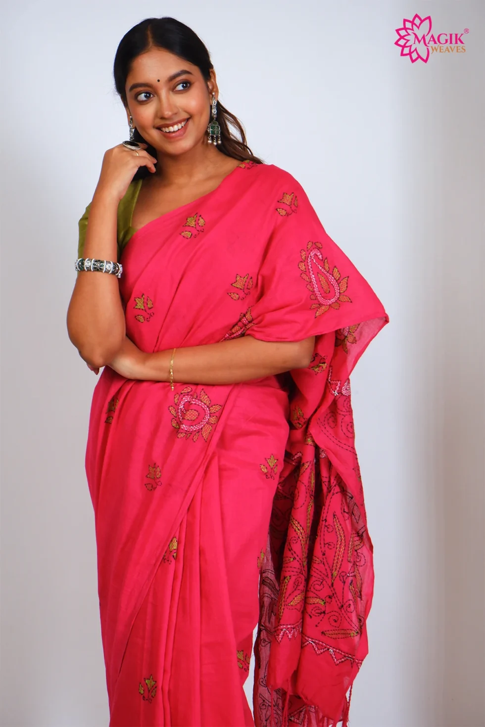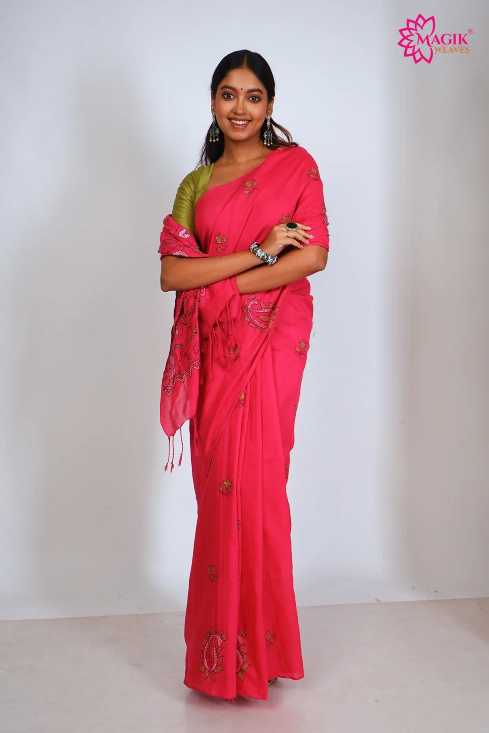 Cotton Kantha Stitch Saree in Tomato Red Colour