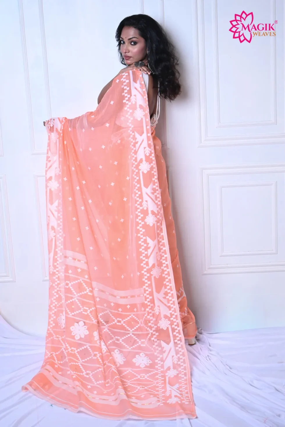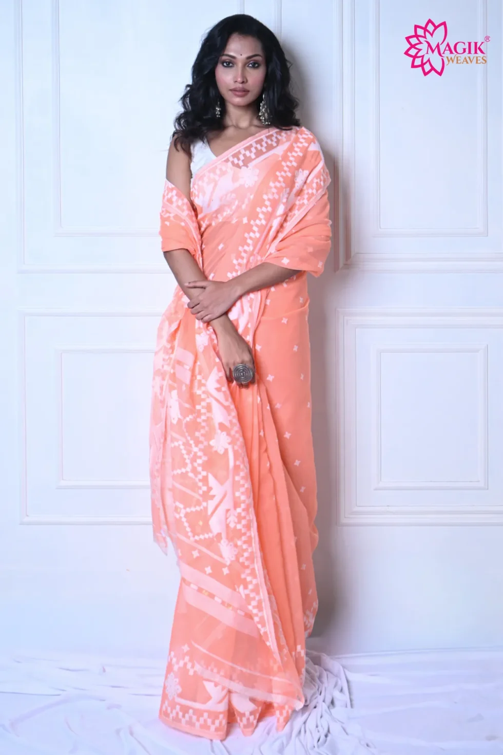 Add a touch of understated grandeur to your ethnic wardrobe with this Peach Cotton Saree, adorned with intricate Jamdani woven motifs. Crafted with care from fine-quality cotton, this saree offers a crisp yet soft texture, ensuring a graceful drape that’s light on the skin and perfect for long festive hours.