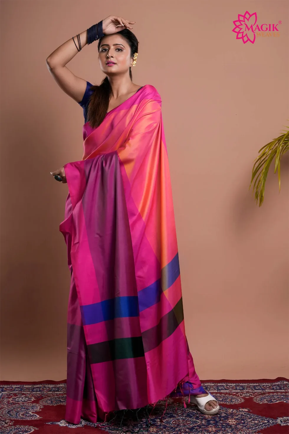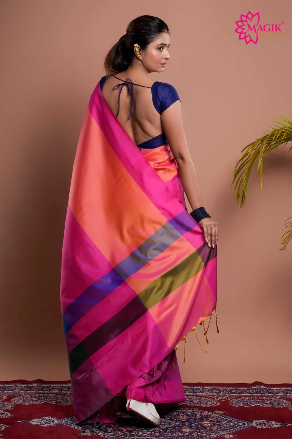 - 3D Texture: The unique Katan weave creates a captivating dimensional effect that enhances the saree’s luxurious appeal.