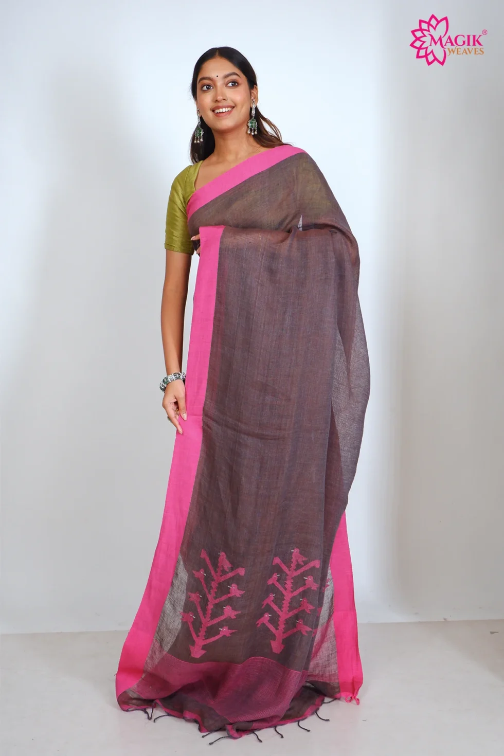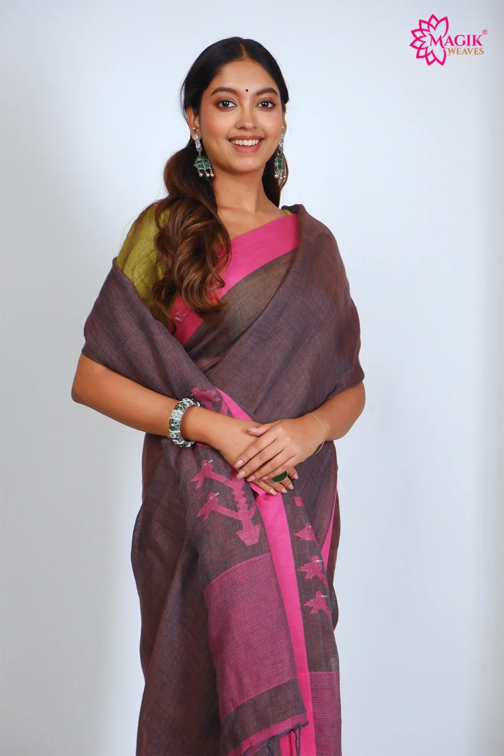A refined brown cotton saree crafted in jamdani weave, featuring and jamdani motif pallu with pink border. Designed for comfort and elegance, it suits office, casual gathering, events occasions effortlessly.