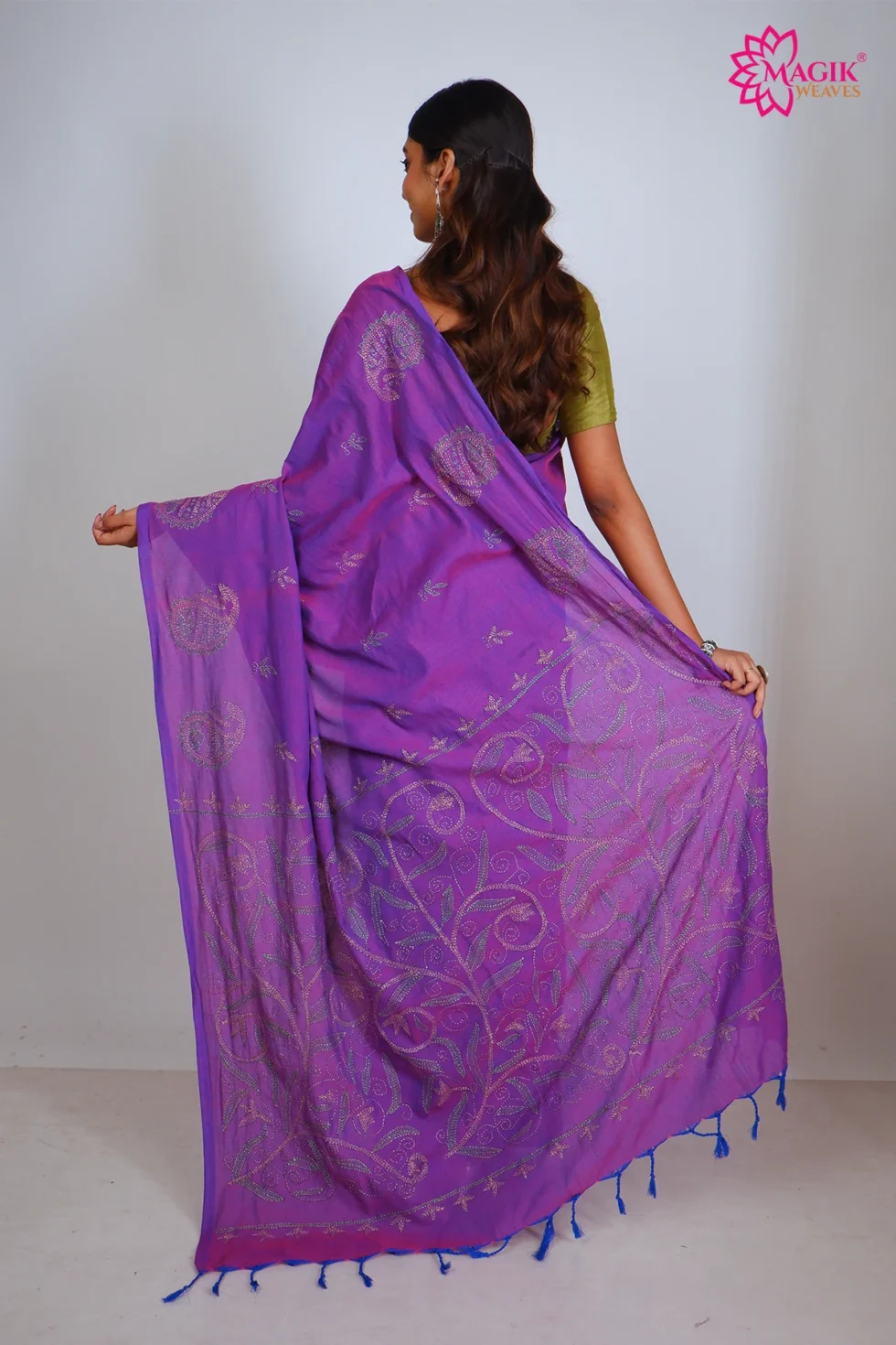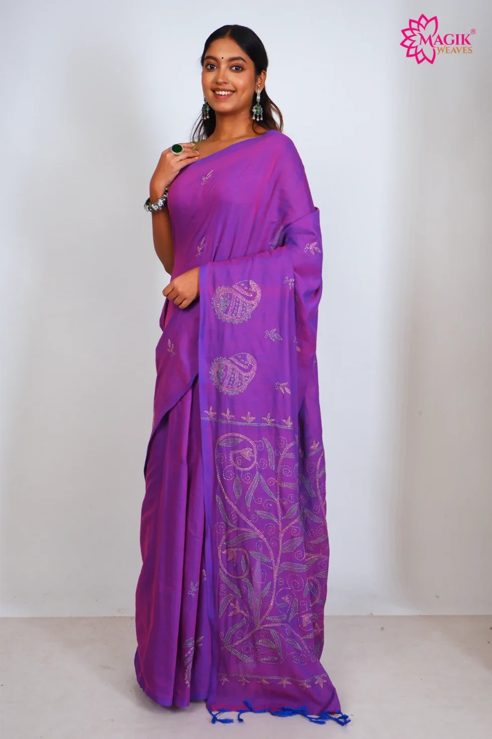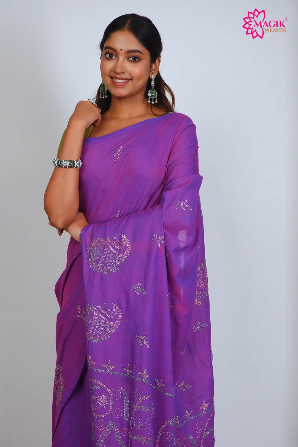 A refined purple cotton saree crafted in kantha stitch weave, featuring geometric & traditional and . Designed for comfort and elegance, it suits office, casual gathering, events occasions effortlessly.