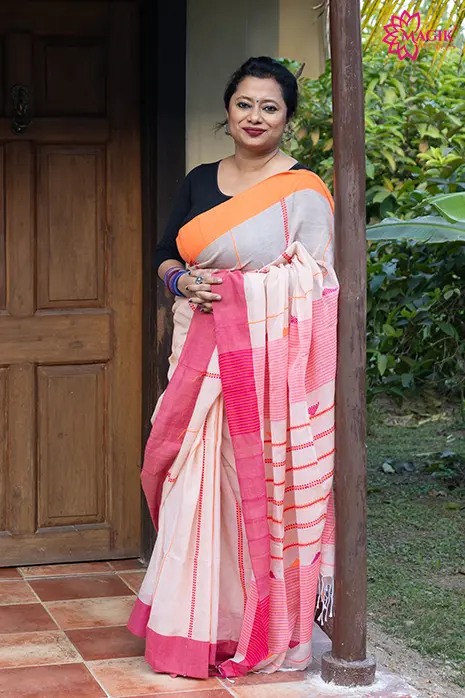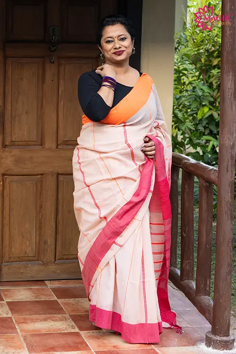 Cream Cotton Bengal Handloom Saree with Ganga Jamuna Border
