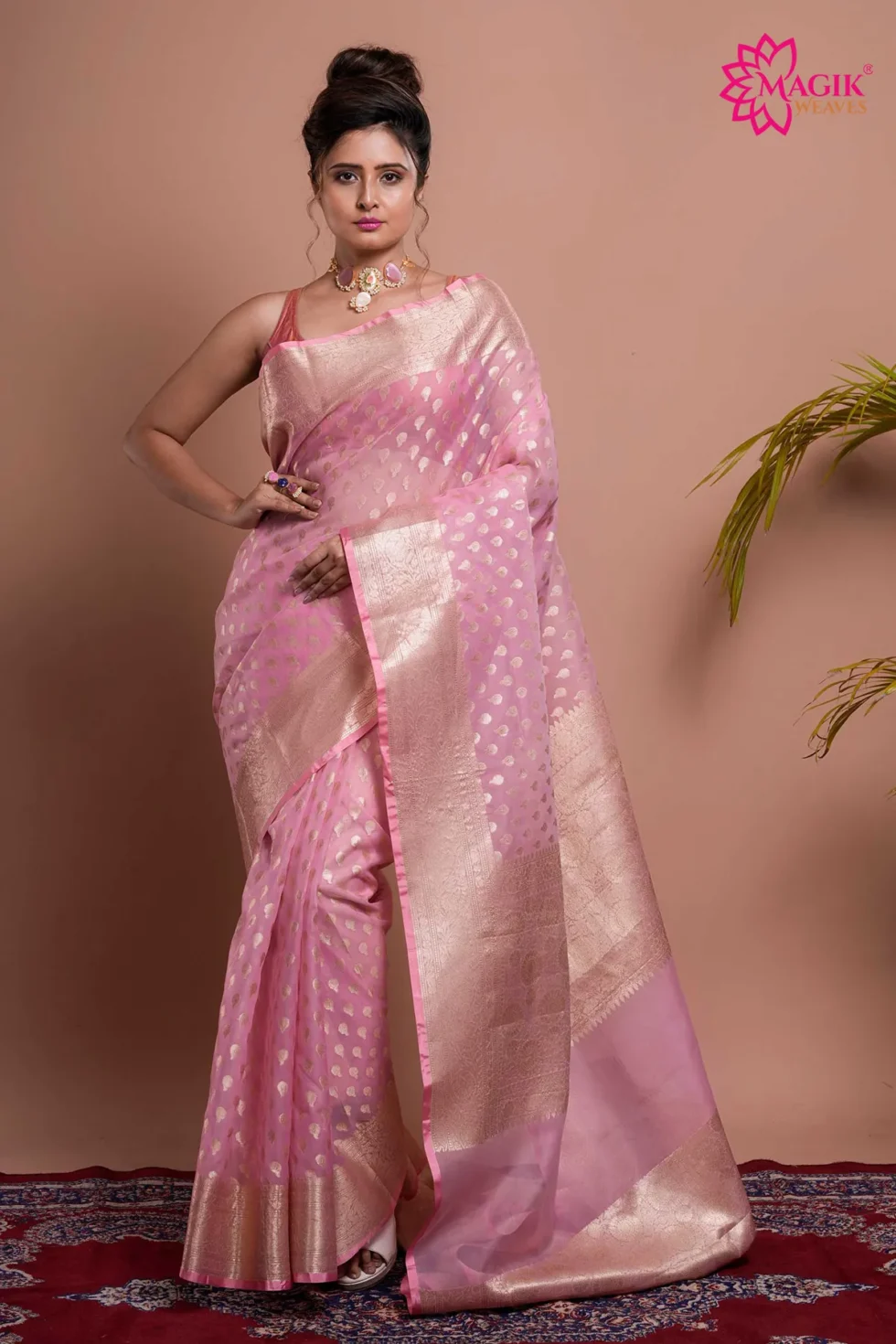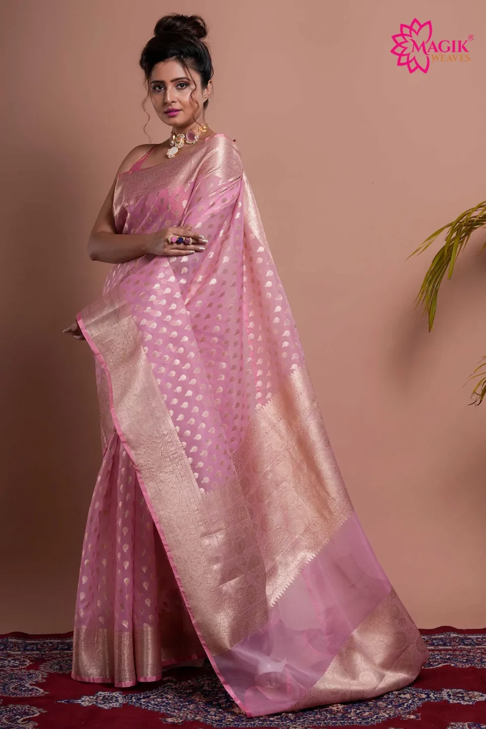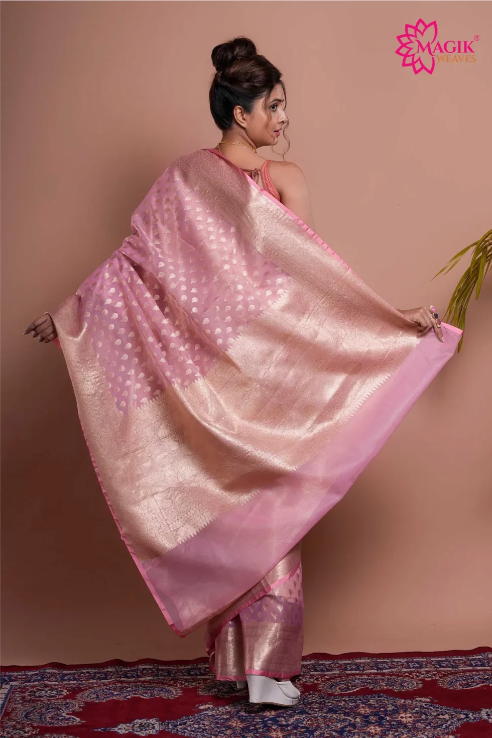 Delicate Pink Banarasi Kora Silk Saree with Golden Zari Buta