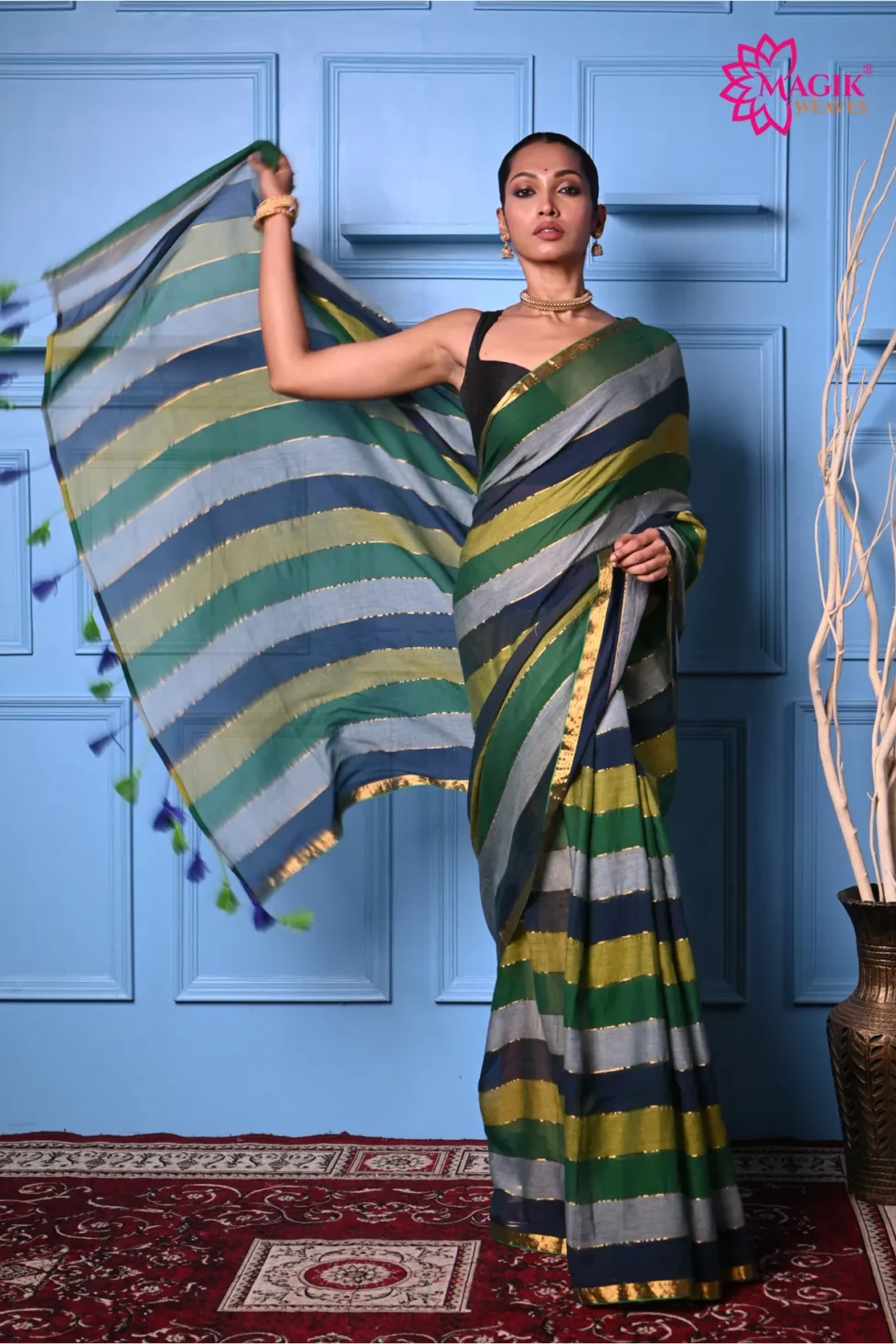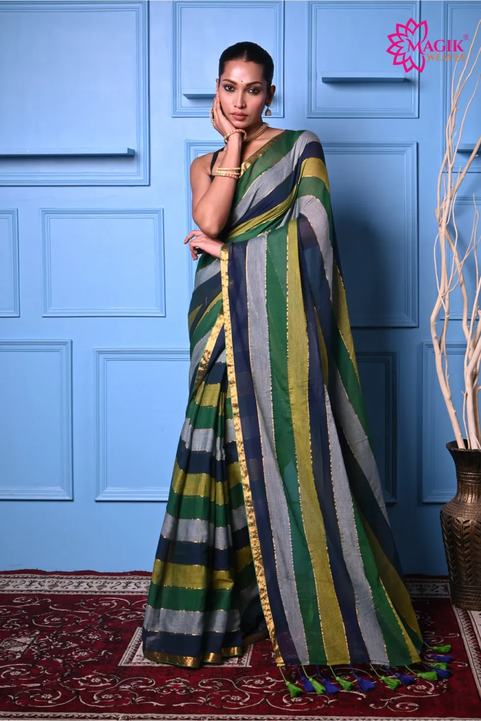 Add a pop of elegance to your festive wardrobe with this striped mul cotton saree in green, blue, and grey. The rich golden border adds a touch of sparkle, making it perfect for celebrations. Lightweight, breathable, and effortlessly stylish — this saree is designed to keep you graceful all day long. A versatile drape that transitions beautifully from casual gatherings to festive occasions.