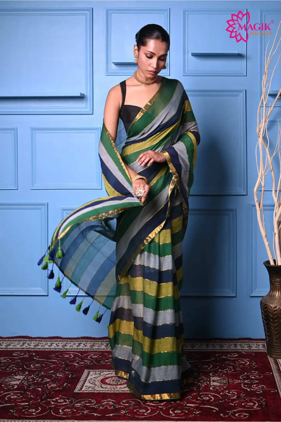Elegant Multi Striped Green Mul Cotton Saree with Golden Border