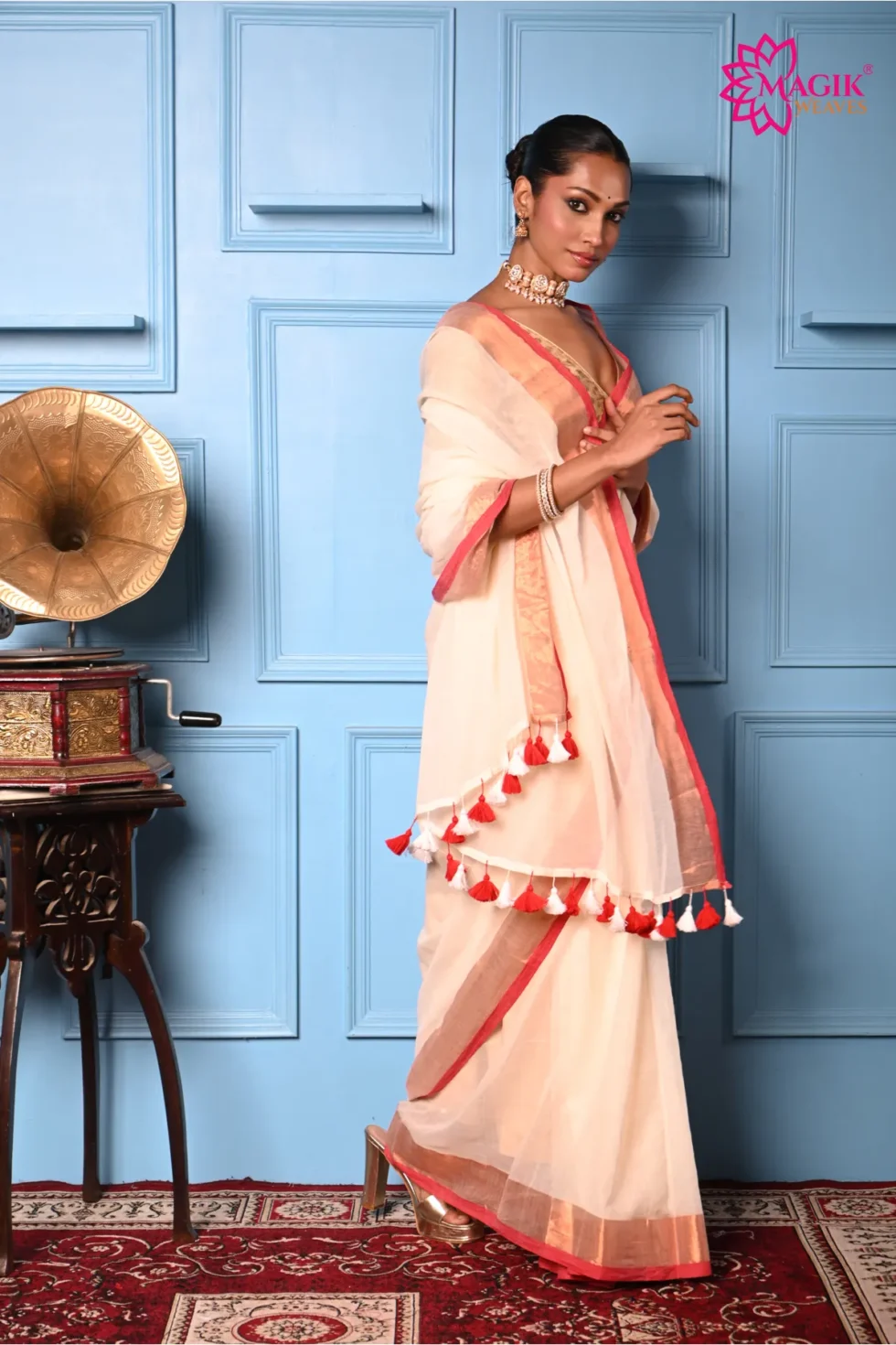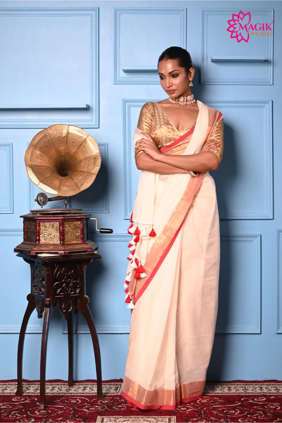 Elegant White Mul Cotton Saree with Red & Zari Border – Onam Style