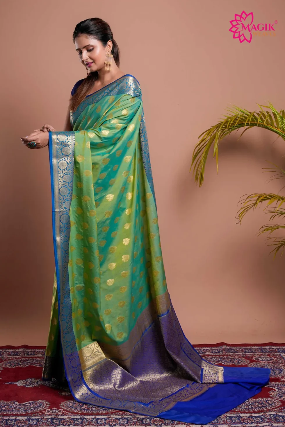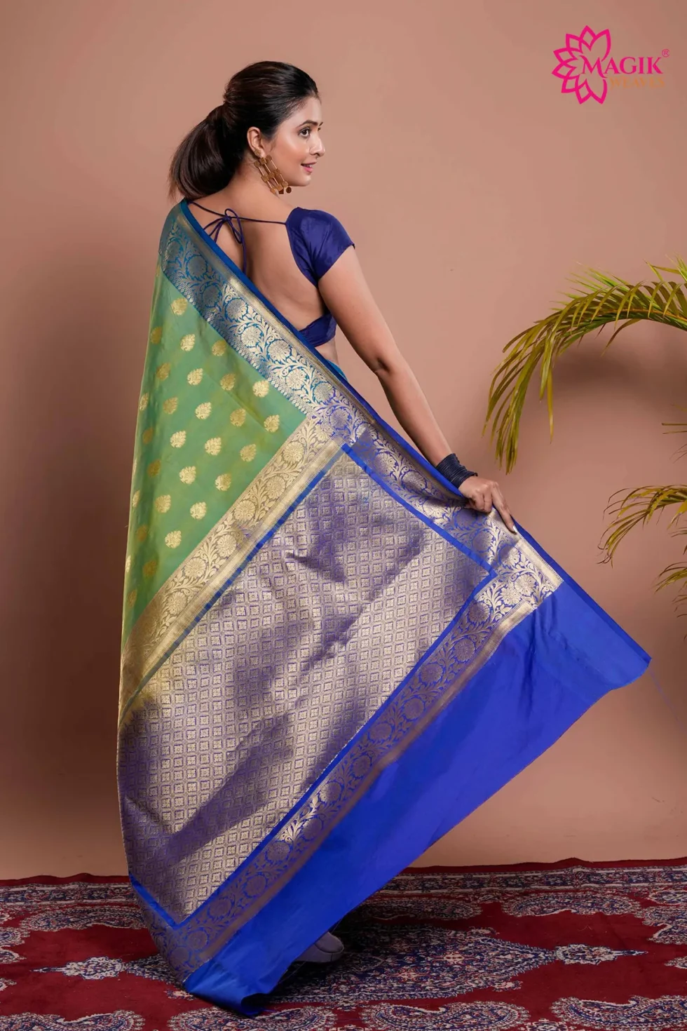 “Emerald Elegance” celebrates the artistry of Banaras in a luxurious Katan silk weave. The rich green body shimmers with delicate silver zari motifs, while the deep blue border creates a striking contrast, enhancing the saree’s majestic appeal. The fabric flows smoothly, offering a comfortable yet regal drape, perfect for weddings, festive occasions, and evening soirées.