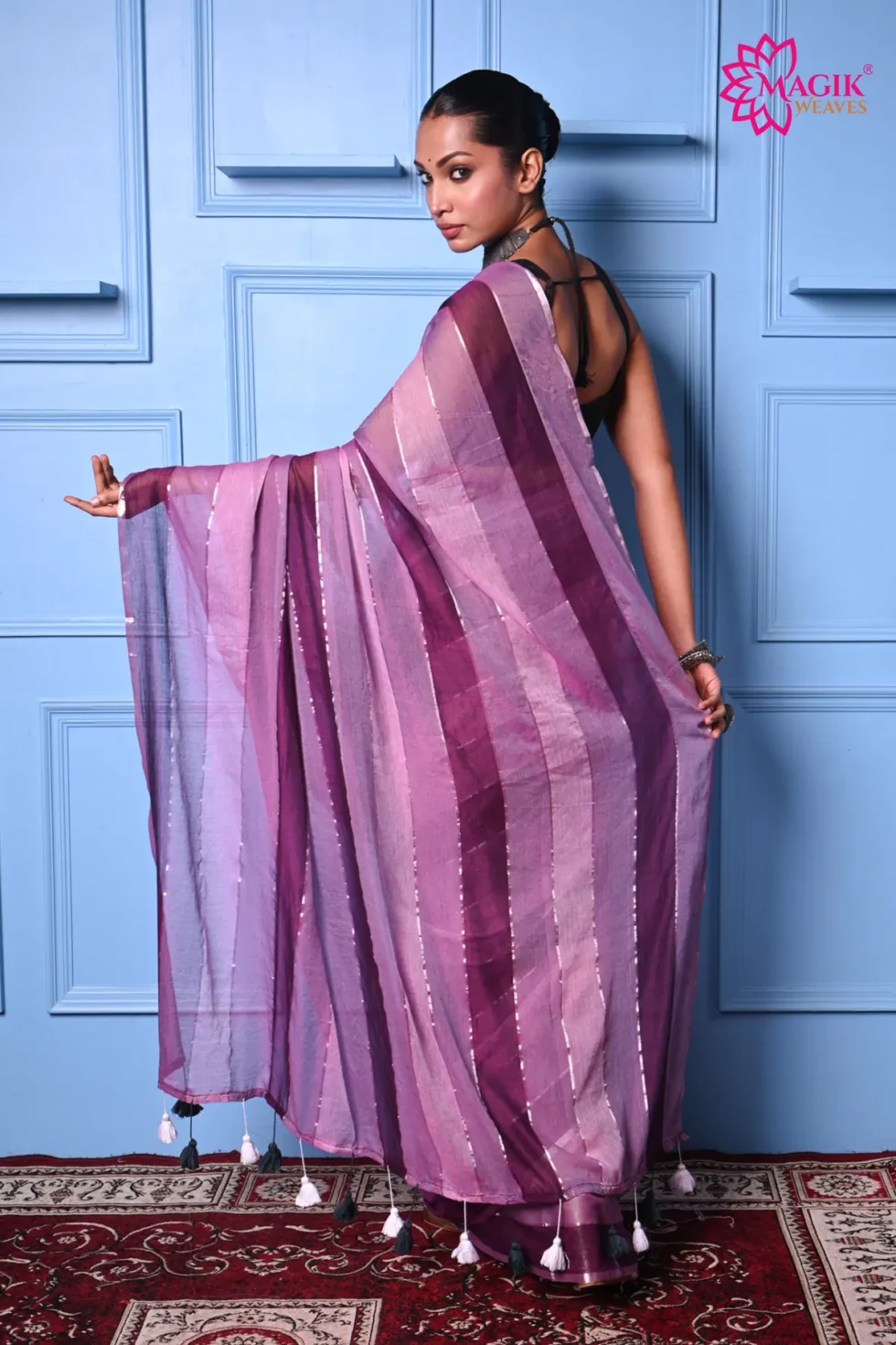Elegant and versatile, this Purple Mul Cotton Saree blends breathable comfort with timeless charm. Its soft drape and striking stripes make it perfect for both everyday wear and special celebrations. The enchanting play of purple tones, highlighted with striking stripes, adds a perfect balance of modern flair and traditional elegance. Whether for festive gatherings, casual outings, or cheerful daytime celebrations, this saree brings a refreshing sophistication to every occasion. With its natural texture and enduring appeal, it’s a versatile treasure every wardrobe deserves.