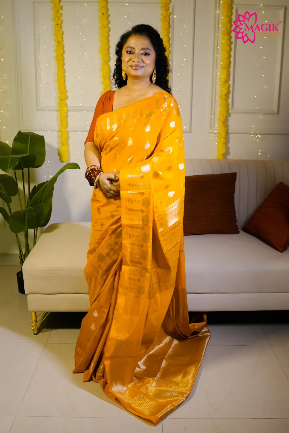 Radiant as the morning sun, Haldiya Roop is a mustard yellow Banarasi mango silk saree drenched in golden charm. Its luminous zari work and regal silk texture make it a masterpiece for festive occasions and grand celebrations.