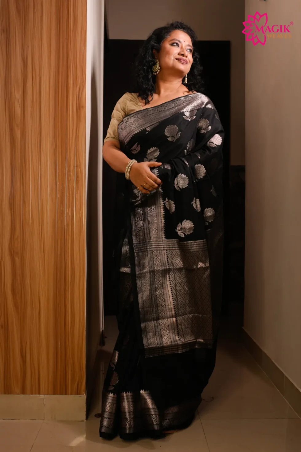 Handwoven Banarasi mango silk in rich black tone