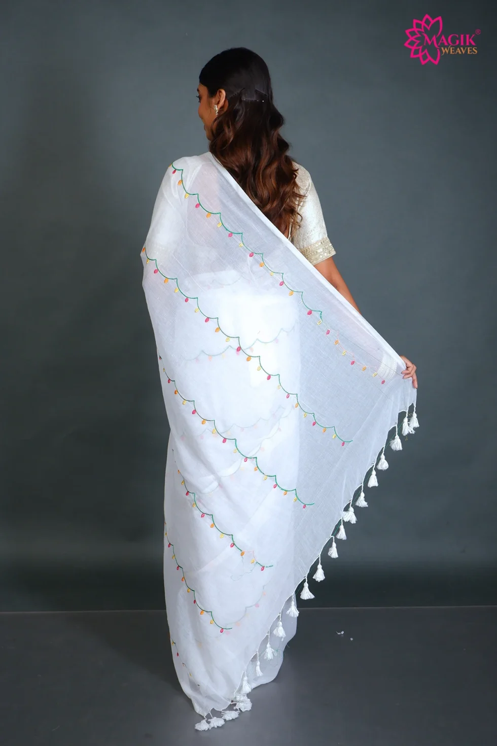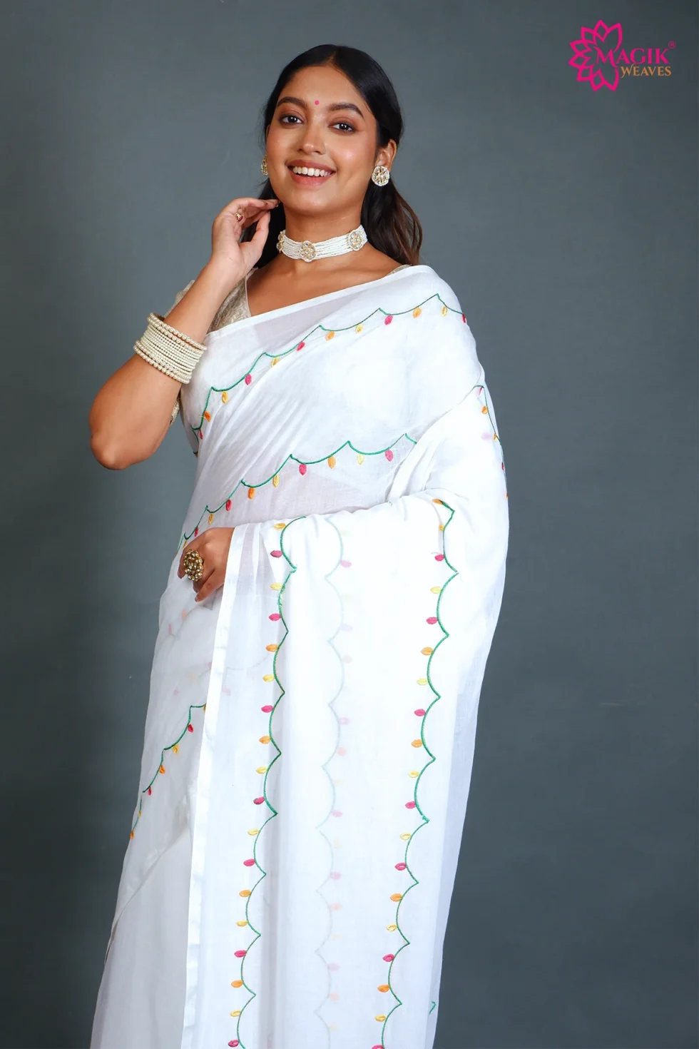 A refined white mul cotton saree crafted in plain weave, featuring scalop design and . Designed for comfort and elegance, it suits office, casual gathering, events occasions effortlessly.