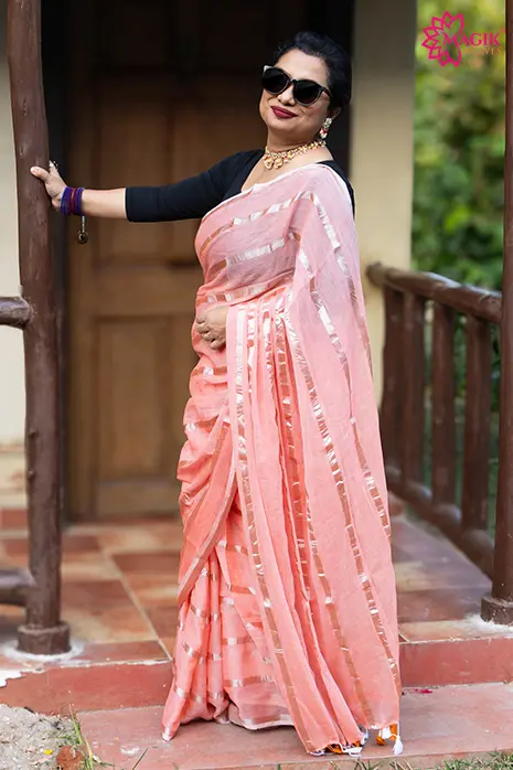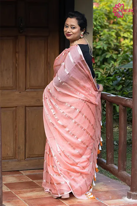 A soft peach mul cotton saree featuring delicate silver zari lines, perfect for casual parties, office wear, or daytime elegance.