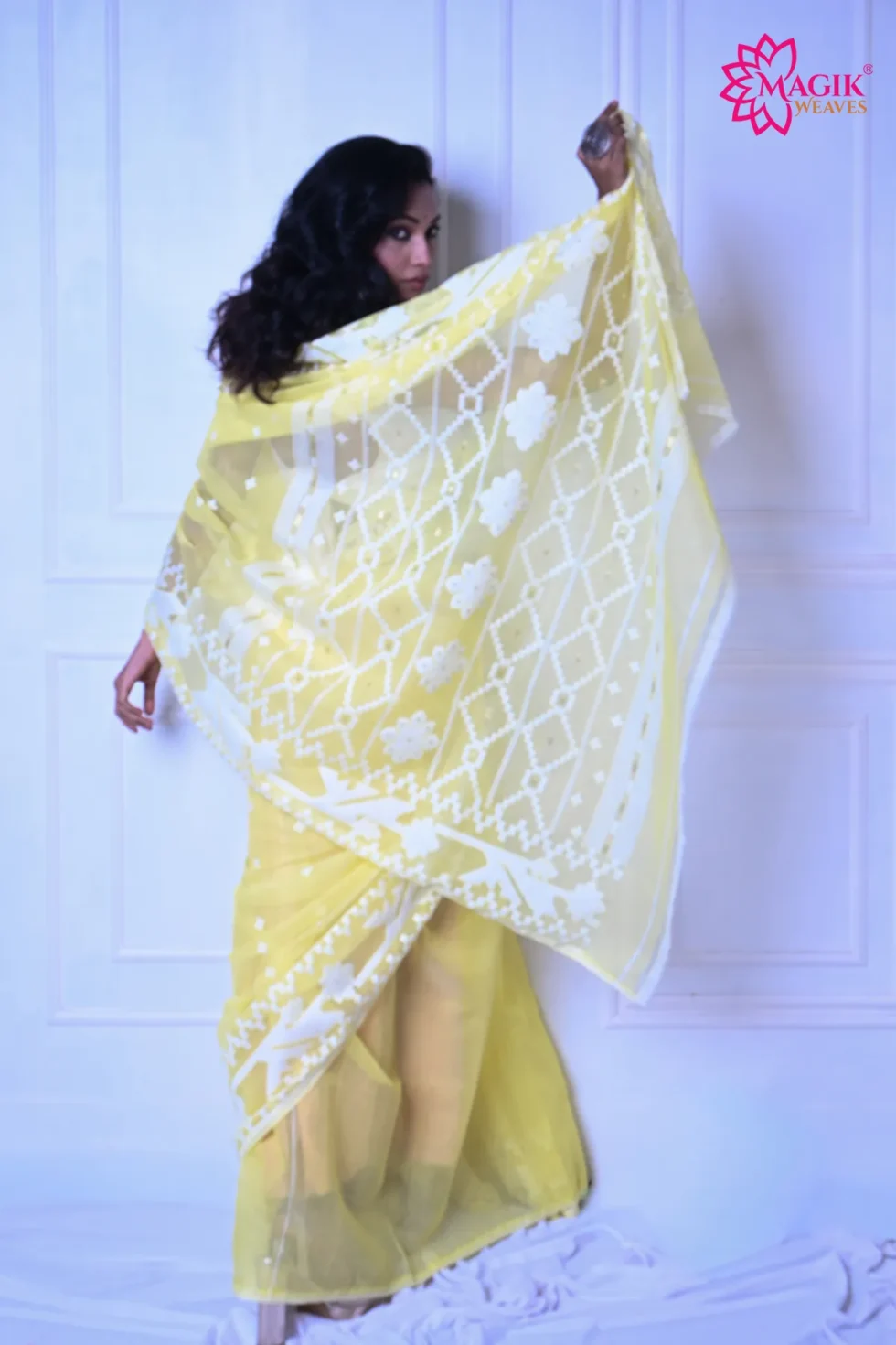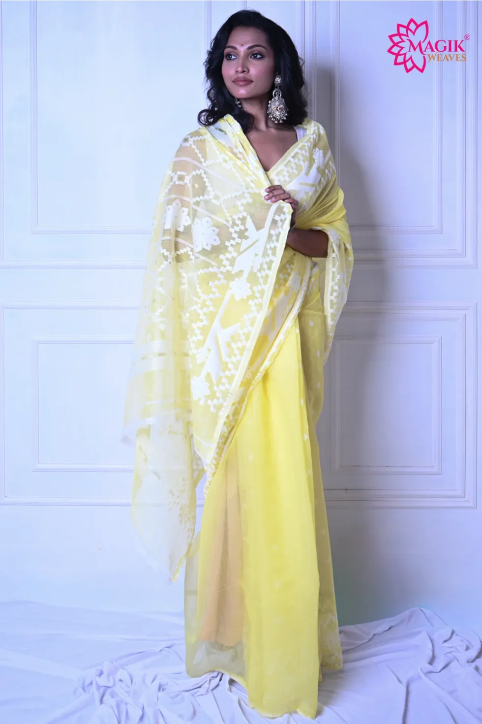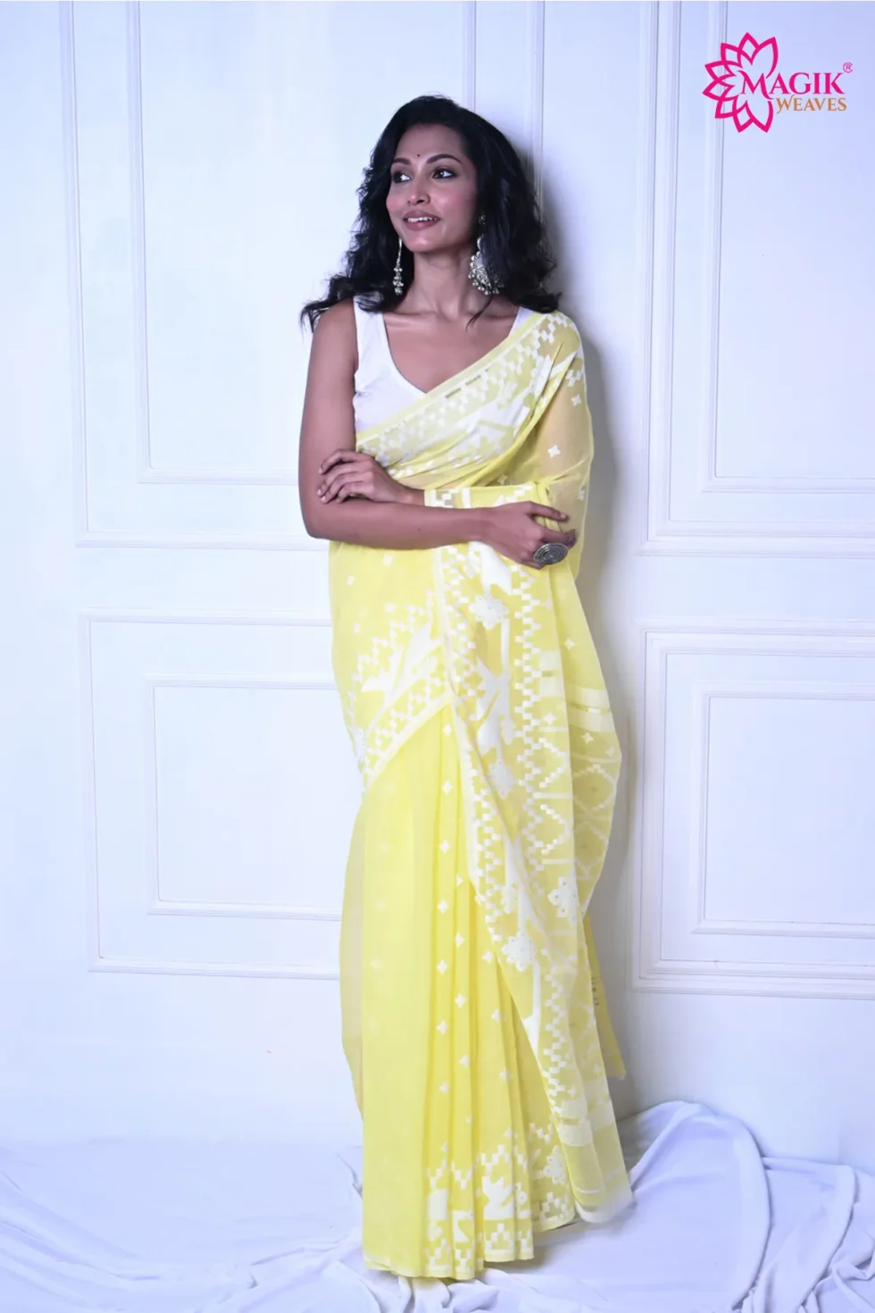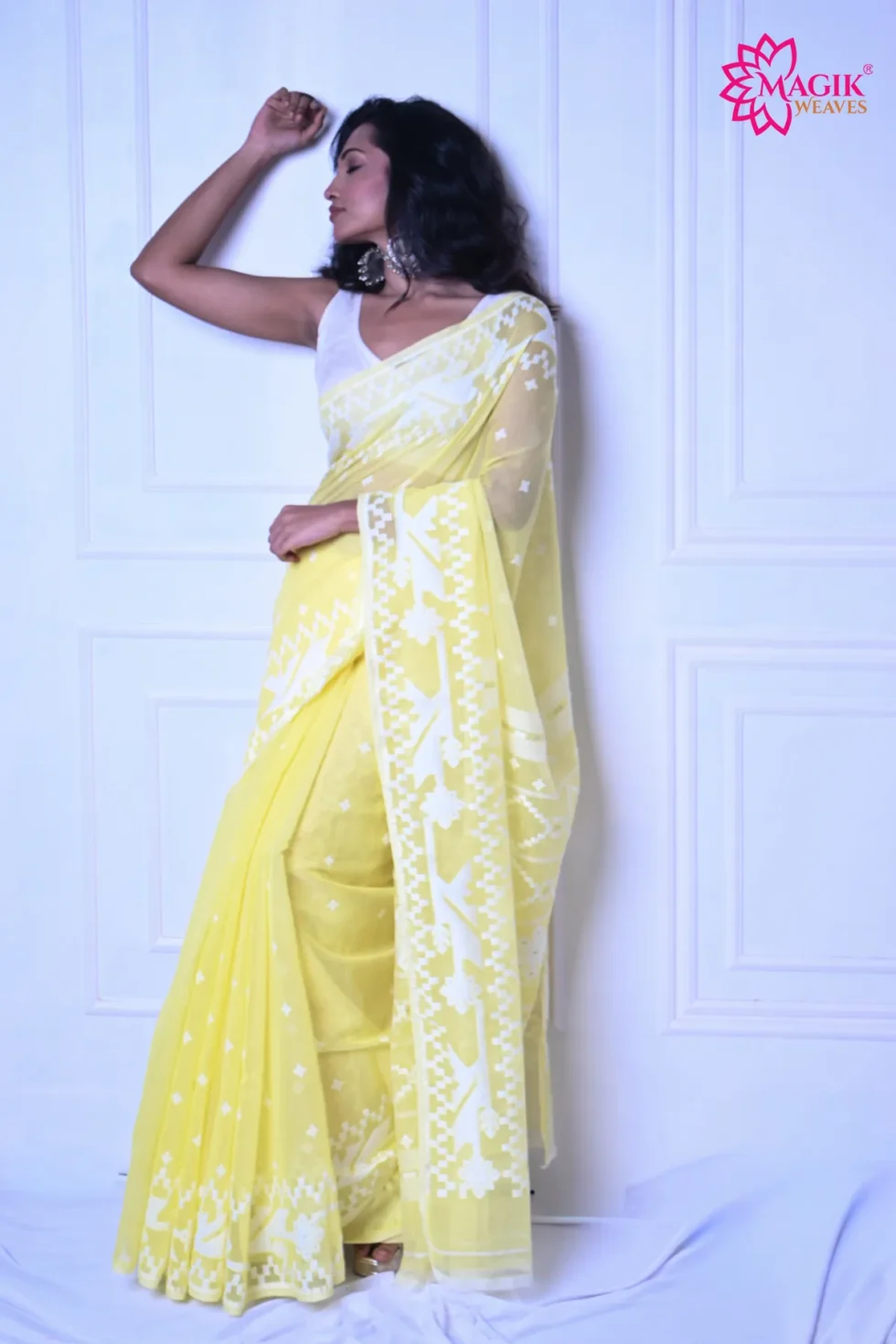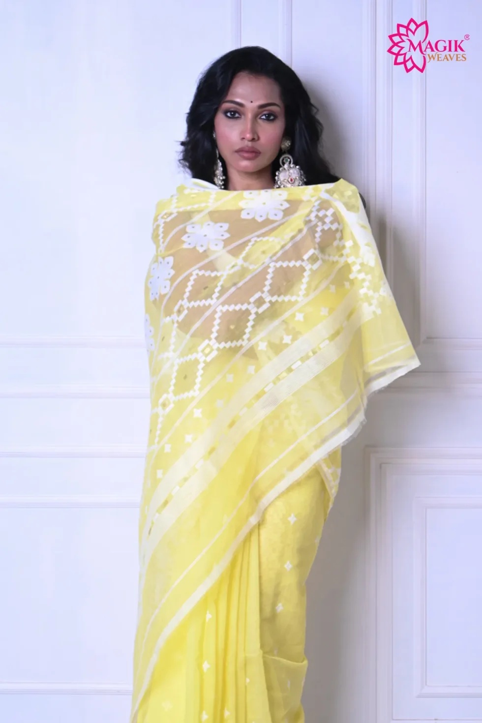 The radiant yellow hue exudes grace and festivity, making it a versatile choice for Pujo, cultural occasions, or wedding-day rituals. Traditional Jamdani patterns gently adorn the body, their subtle shimmer enhancing the natural elegance of the cotton weave. The interplay of heritage craftsmanship with a contemporary pastel shade creates a look that’s both classic and refreshing.