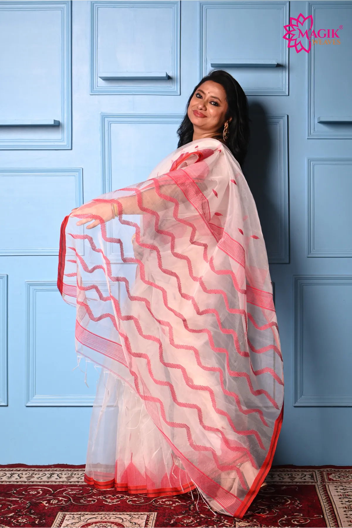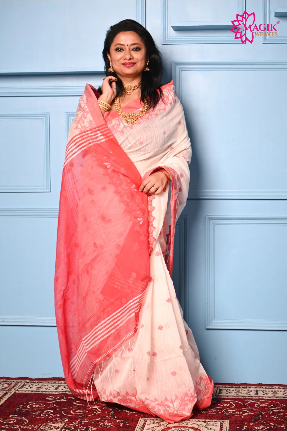 Designed with equal attention to comfort and beauty, its breathable cotton fabric makes it ideal for long wear, while the structured fall ensures a timeless silhouette. Rooted in handloom artistry, this saree reflects the quiet luxury of tradition reimagined.