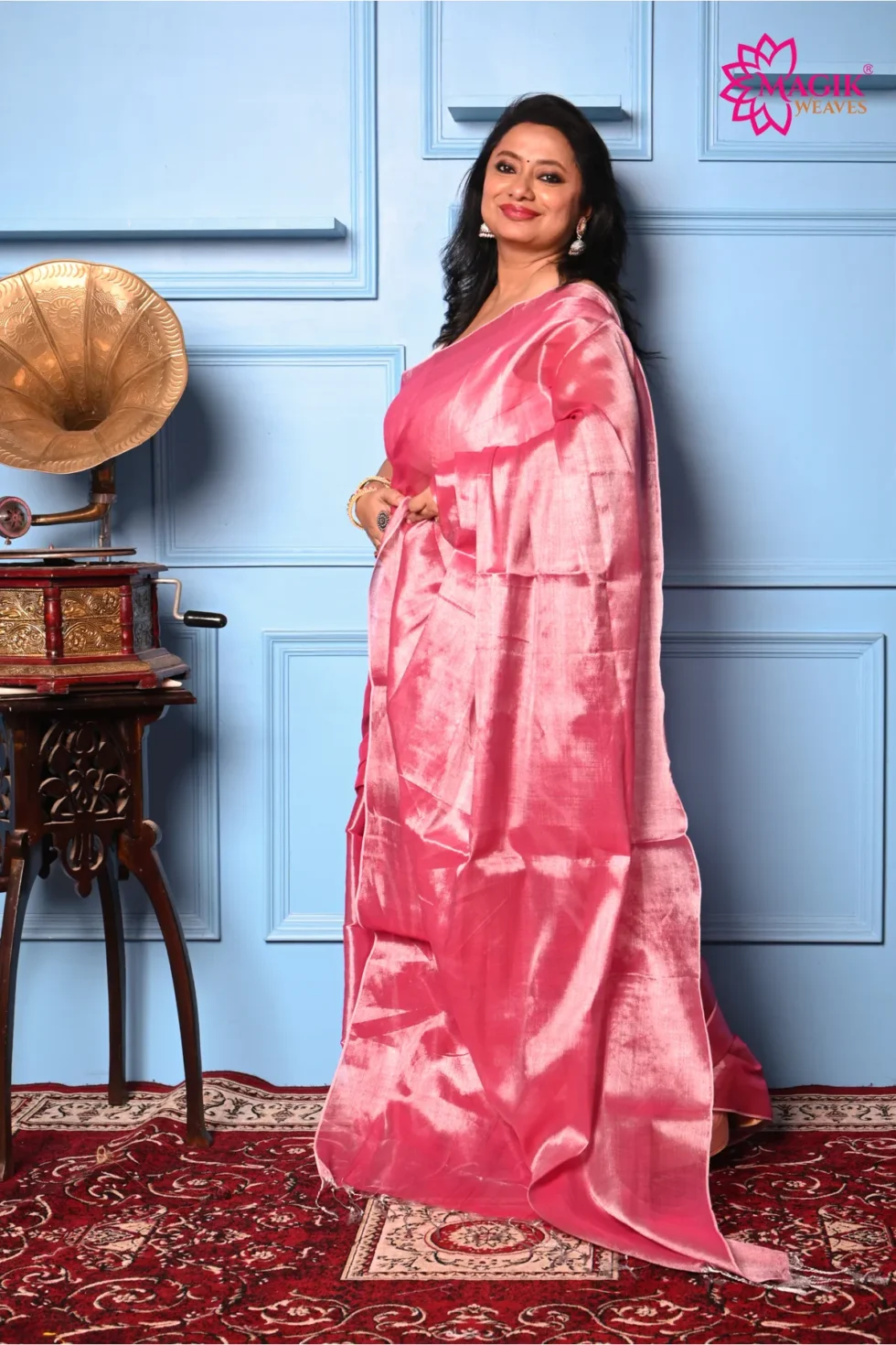 Shine bright in this metallic pink tissue saree, crafted for timeless elegance and modern glamour. Lightweight yet luxurious, it’s the perfect choice for weddings, festive nights, and grand celebrations.