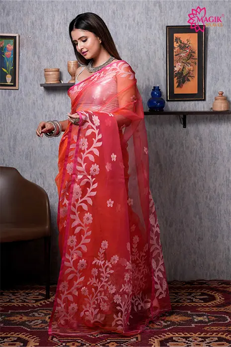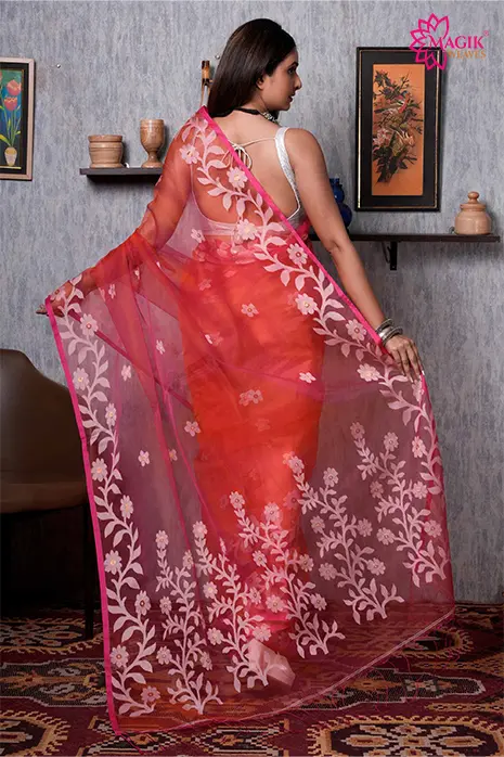 Drape yourself in luxurious lightness with this exquisite red Resham Muslin Jamdani saree, featuring traditional intricate weaving for sophisticated festive wear.