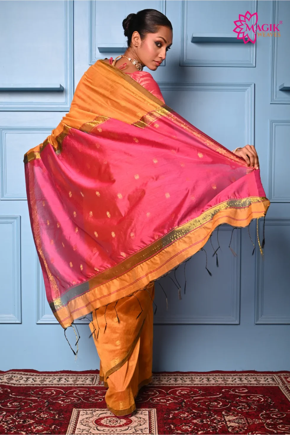 The mustard yellow body is adorned with shimmering golden buta motifs, exuding warmth, radiance, and traditional charm. The contrasting rani pink pallu adds a vibrant touch of glamour, creating a striking balance between subtlety and boldness.