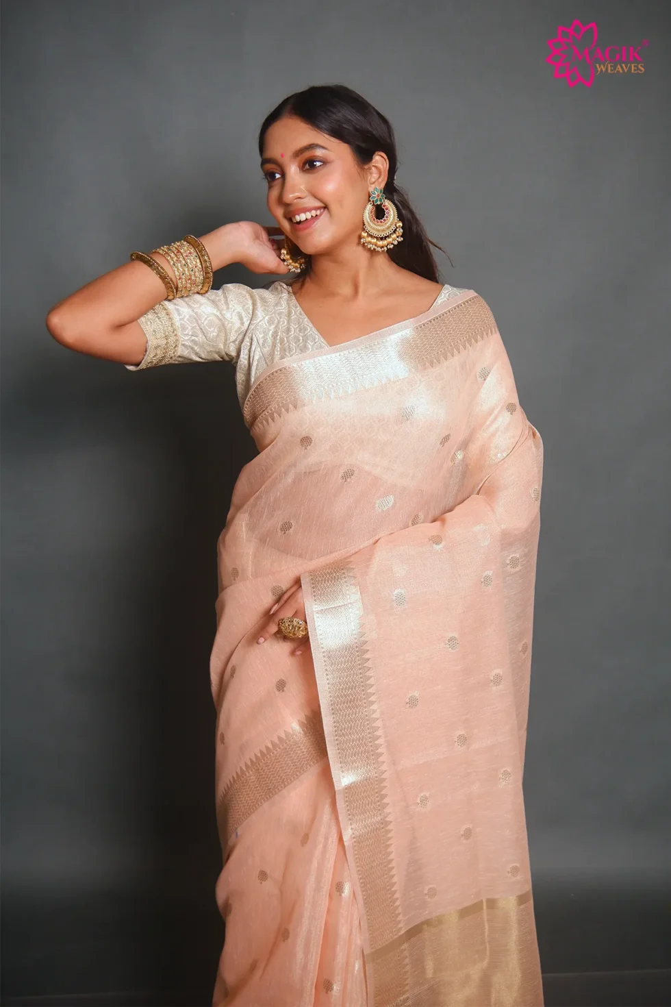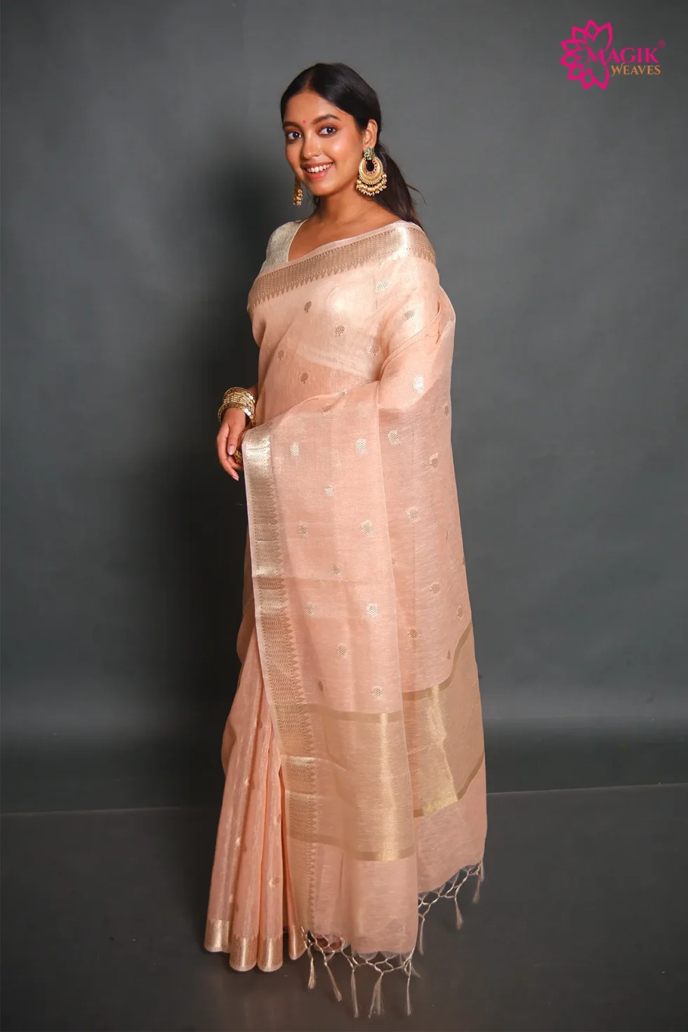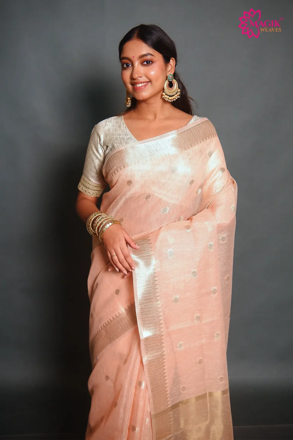 Graceful and refined, this light pink tissue linen saree features delicate golden zari buti motifs complemented by a traditional temple zari border. The breathable weave and soft texture offer a lightweight drape, making it suitable for casual gatherings, festive events, and elegant formal occasions.