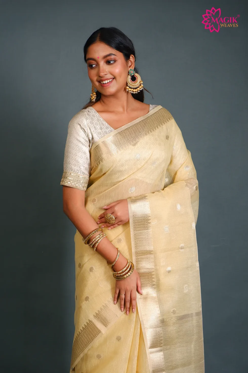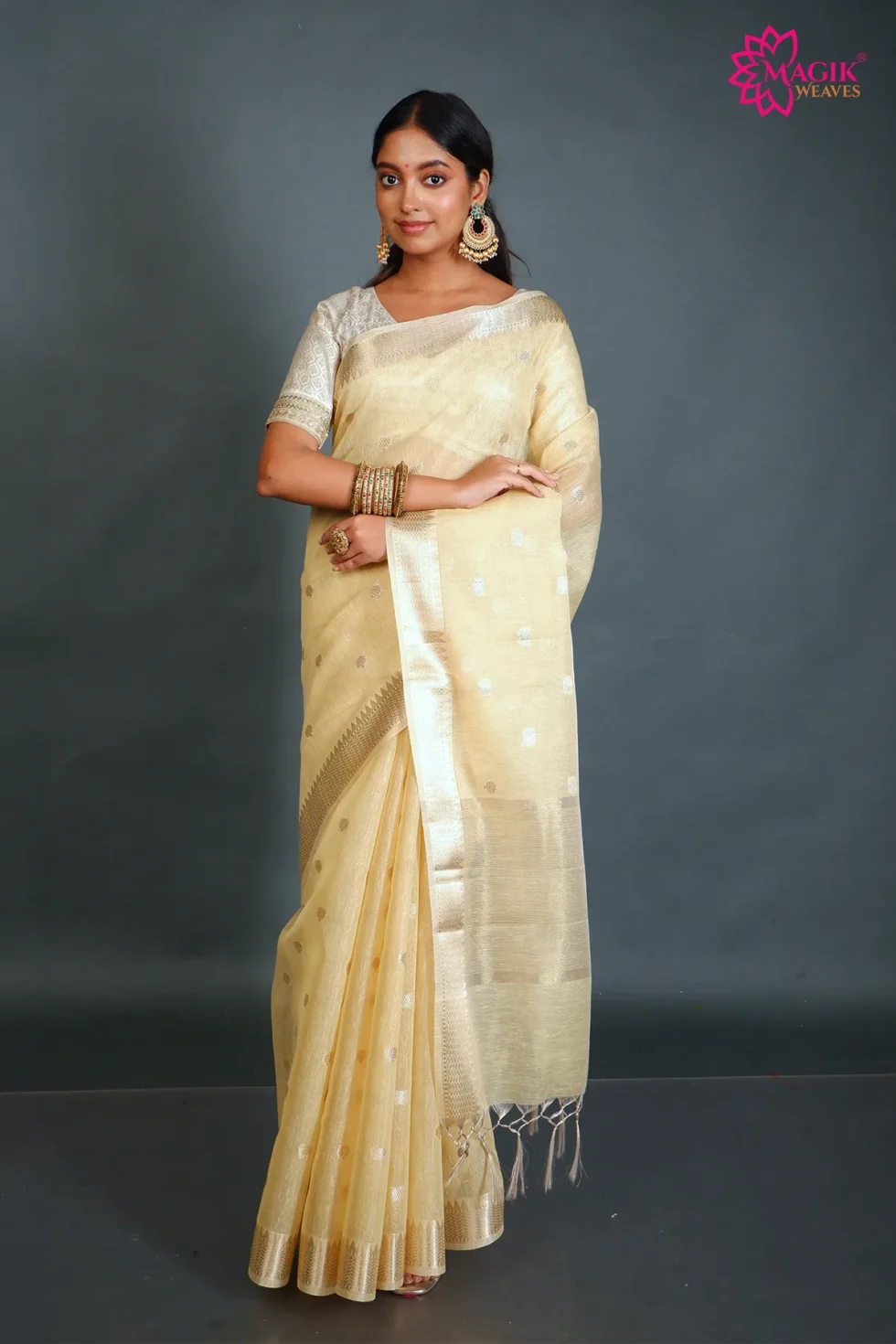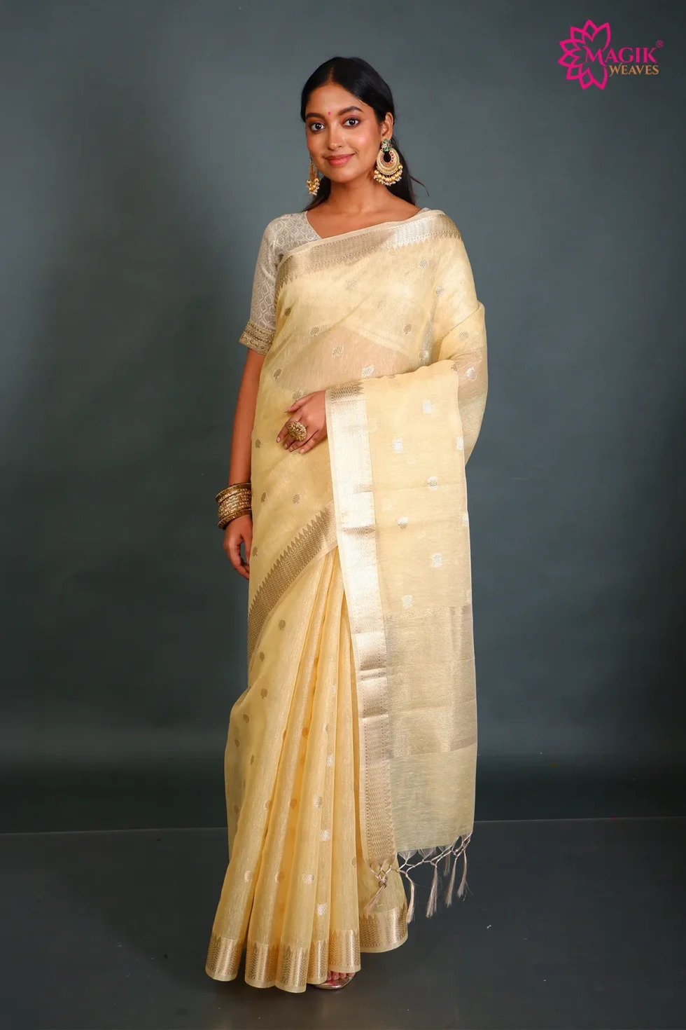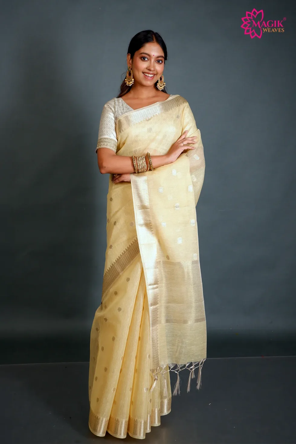 Graceful and refined, this light yellow tissue linen saree features delicate golden zari buti motifs and a traditional temple zari border. The airy weave and soft texture create a lightweight drape, making it comfortable for casual gatherings, festive meet-ups, and elegant formal occasions.