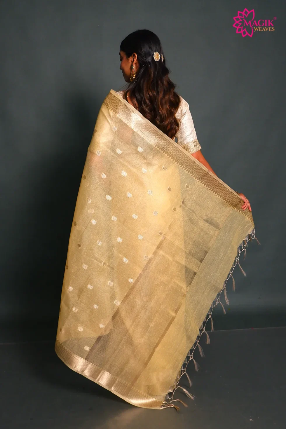 Woven from premium tissue linen, the saree offers a delicate balance of texture and comfort. The breathable fabric allows easy movement while maintaining a structured appearance. Its airy weave ensures comfort during long hours, making it a practical yet elegant wardrobe choice.