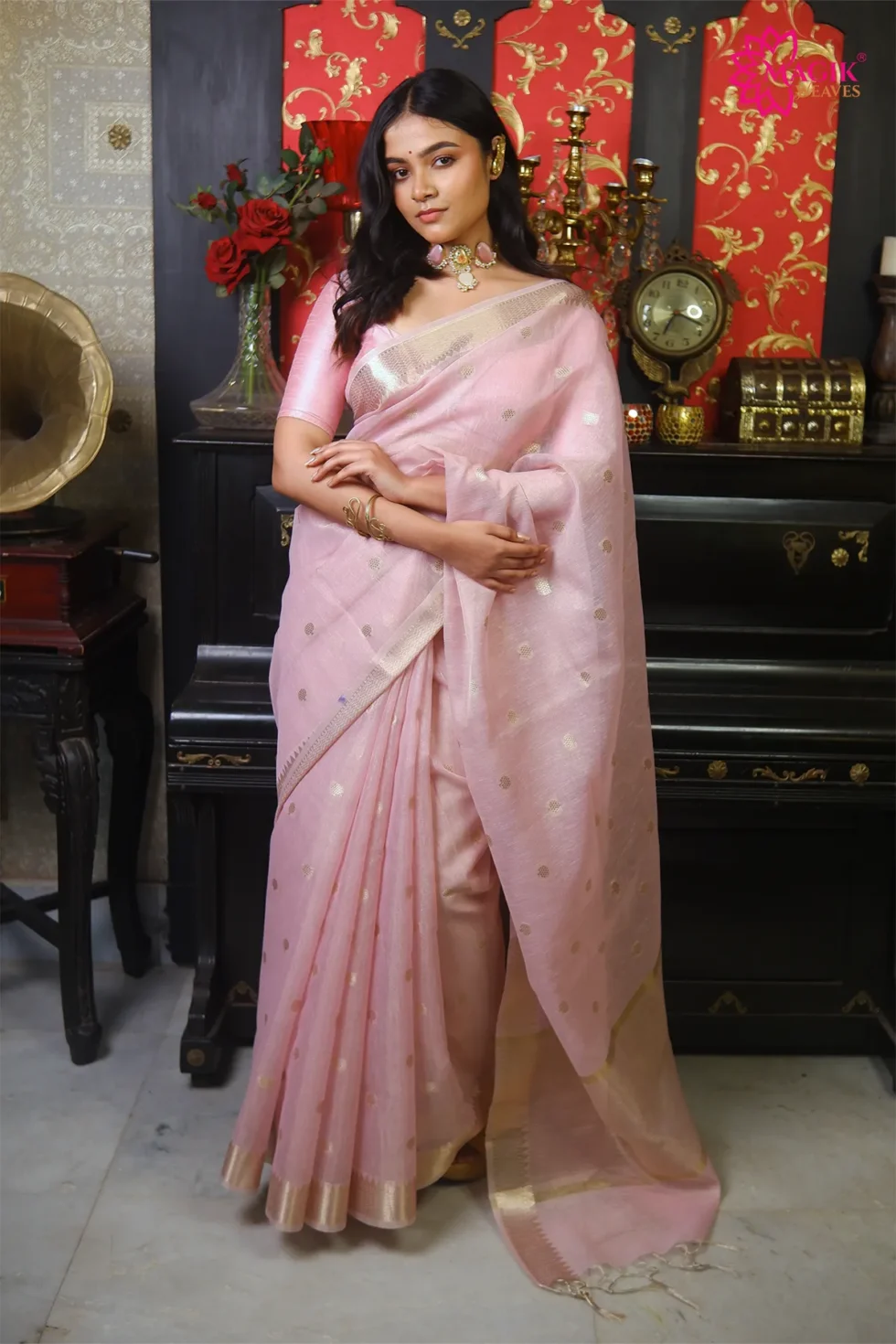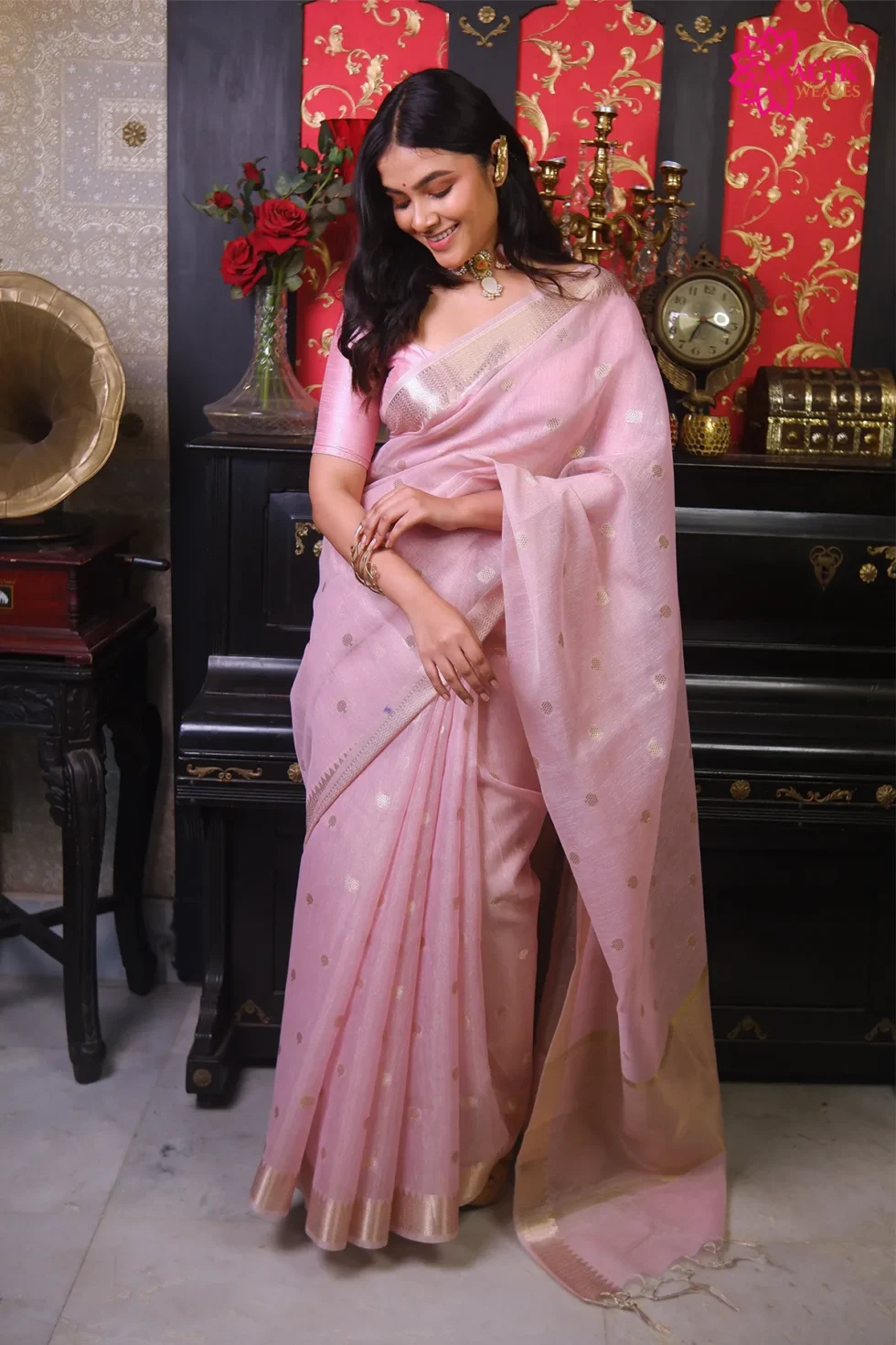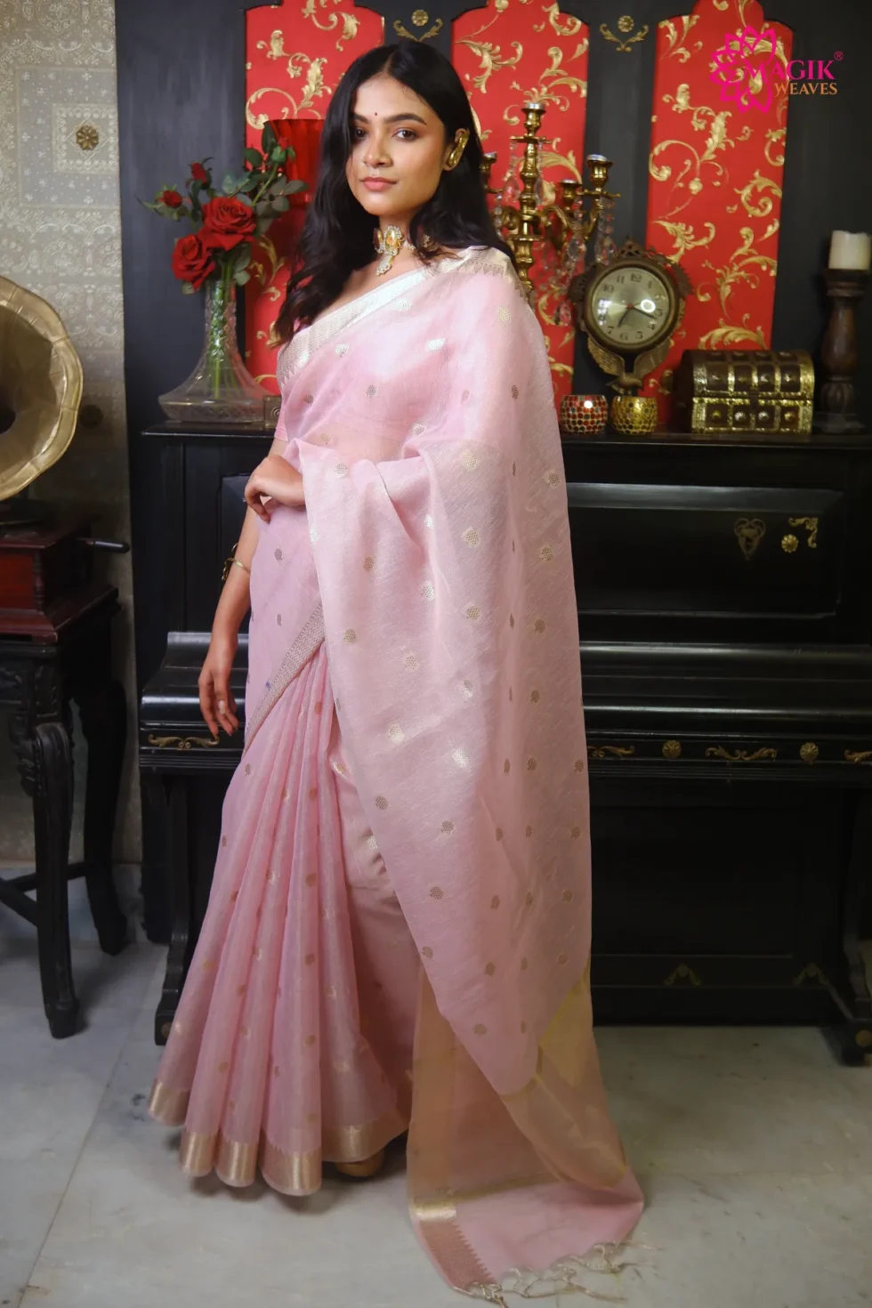 Tissue Linen Saree in Pink with Golden Zari Buti